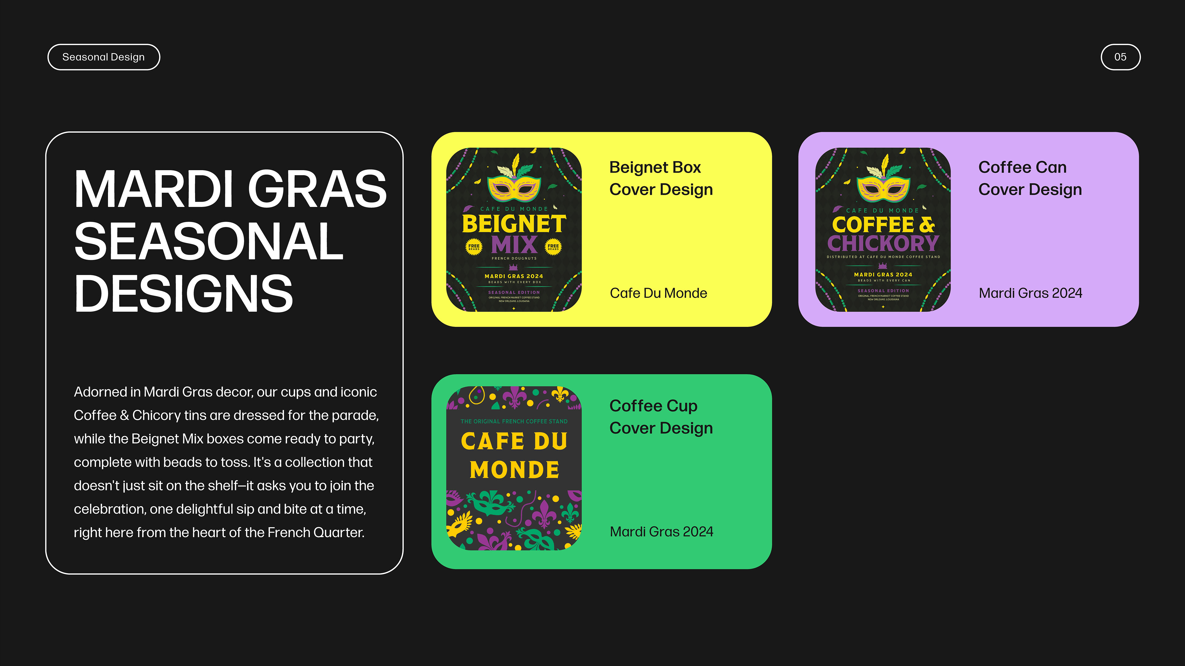 The Seasonal Line includes Beignet Mix, the Coffee & Chickory Tin Can, and Cups.